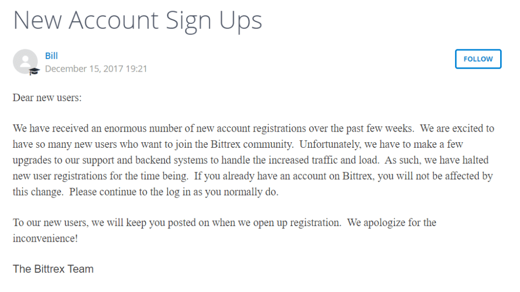Şuanda bir çok coin alım satım yapan büyük firmalar kullanıcı alımlarına kapattılar. Bunlardan en çok kullanılan Bittrex ve Binance şu mesajı yayınlıyorlar.