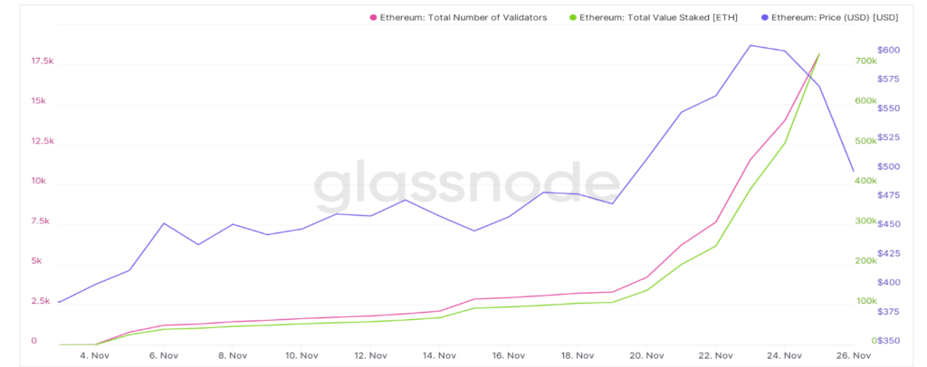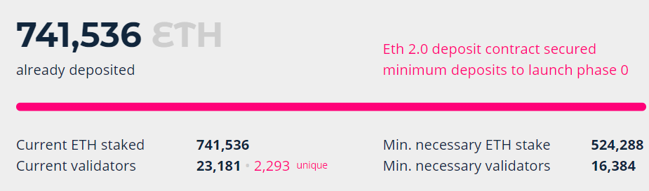 Eth 2.0 güncellemesi için gerekli Ethereum Stake miktarı 23,181 validatörün (onaycı) güncellemeye katılmasıyla birlikte sağlandı. Gerekli şartların yerine getirilmeseinin ardından 1 Aralık 2020’de güncellemenin ilk adımının gerçekleştirilmesi beklenmektedir. 741,536 ETH’nin Stake edilmesiyle birlikte kripto para platformlarında dolaşmakta olan Ethereum miktarlarında düşüş yaşanmıştır. Arzın azalmasının diğer fazların etkileriyle birlikte 2021 yılında Ethereum fiyatını arttıracağı tahmin edilmektedir.