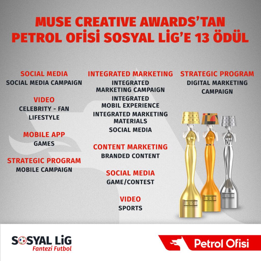 Dünyada futbolseverlerin heyecanla takip ettikleri “fantezi futbol” oyununu Türkiye’ye taşıyan Petrol Ofisi Sosyal Lig, hem uygulama olarak hem de yürütülen iletişim çalışmalarındaki başarıları ile MUSE Creative Awards’ta, 5 Gold, 7 Silver ve 1 de Platinum olmak üzere 13 farklı ödüle layık görüldü.