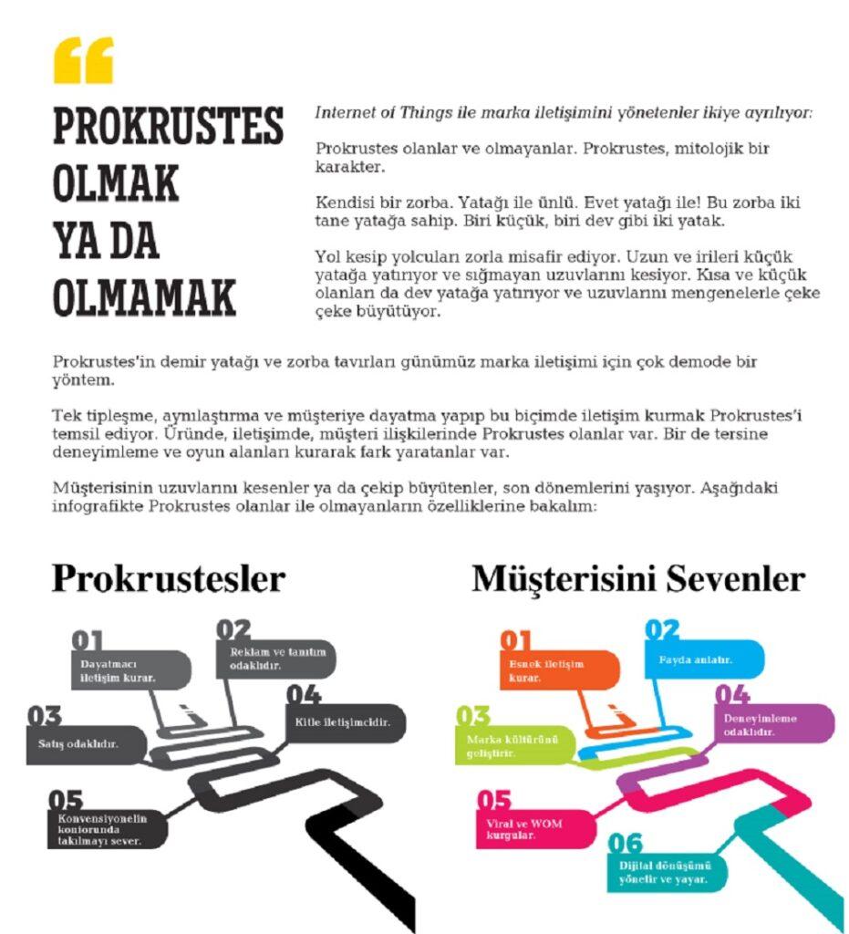 Tek tipleşme, aynılaştırma ve müşteriye dayatma yapıp bu biçimde iletişim kurmak Prokrustes’i temsil ediyor. Üründe, iletişimde, müşteri ilişkilerinde Prokrustes olanlar var. Bir de tersine deneyimleme ve oyun alanları kurarak fark yaratanlar var.