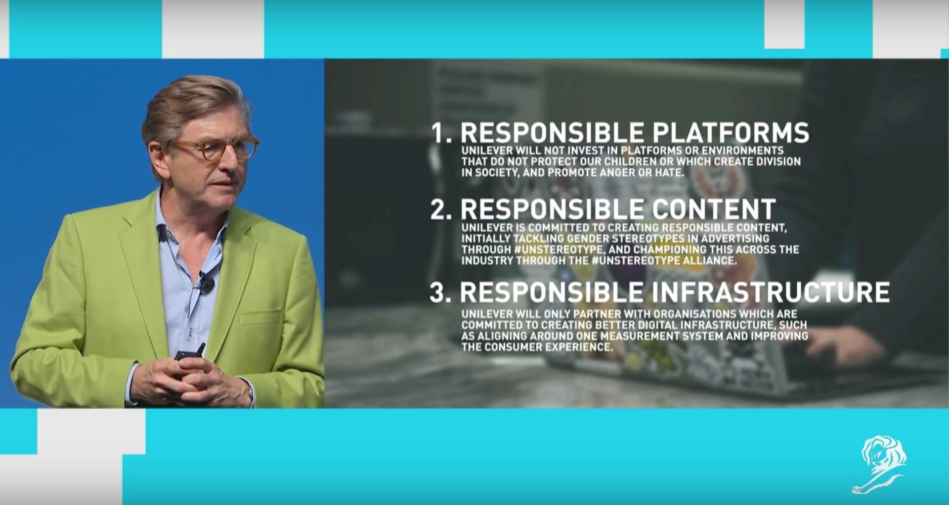 İkincisi içeriklerdeki sorumluluk: Unilever basmakalıp inanışları yıkmak adına reklamlardaki cinsiyet klişelerini bırakacak ve bunu #unstereotype hareketi ile endüstriye bir çağrıya dönüştürecektir.